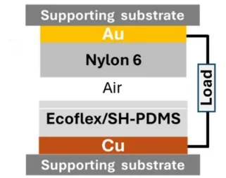 Electrostatic induction during periodic contact and separation is the main operational principle of the CS-TENG devices made from Ecoflex/SH-PDMS/Cu and nylon 6/Au layers. An interface dipole layer is created on each material/electrode junction by pressing the two layers and contact electrification. By releasing the layers, an output signal is generated by the flow of electrons in the external circuit due to the electrostatic induction. A reverse current flow will happen during the next pressing step. Consequently, alternating current signals are produced by continuous periodic contact separation of the two layers.
