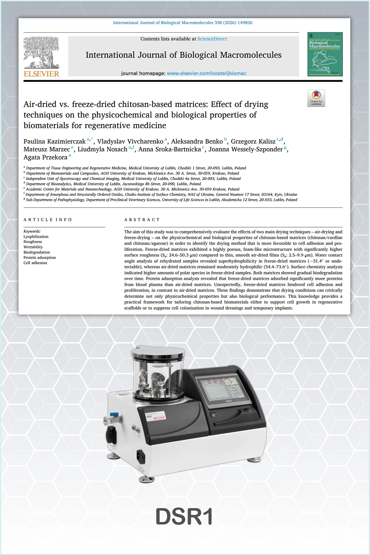 The work compared air-dried and freeze-dried matrices, revealing significant differences in microstructure and biological performance. Freeze-dried samples exhibited a highly porous and rough structure with strong protein adsorption, while air-dried matrices formed smoother films and supported better cell adhesion and proliferation, demonstrating that the drying process strongly influences the biological response to the biomaterial.
