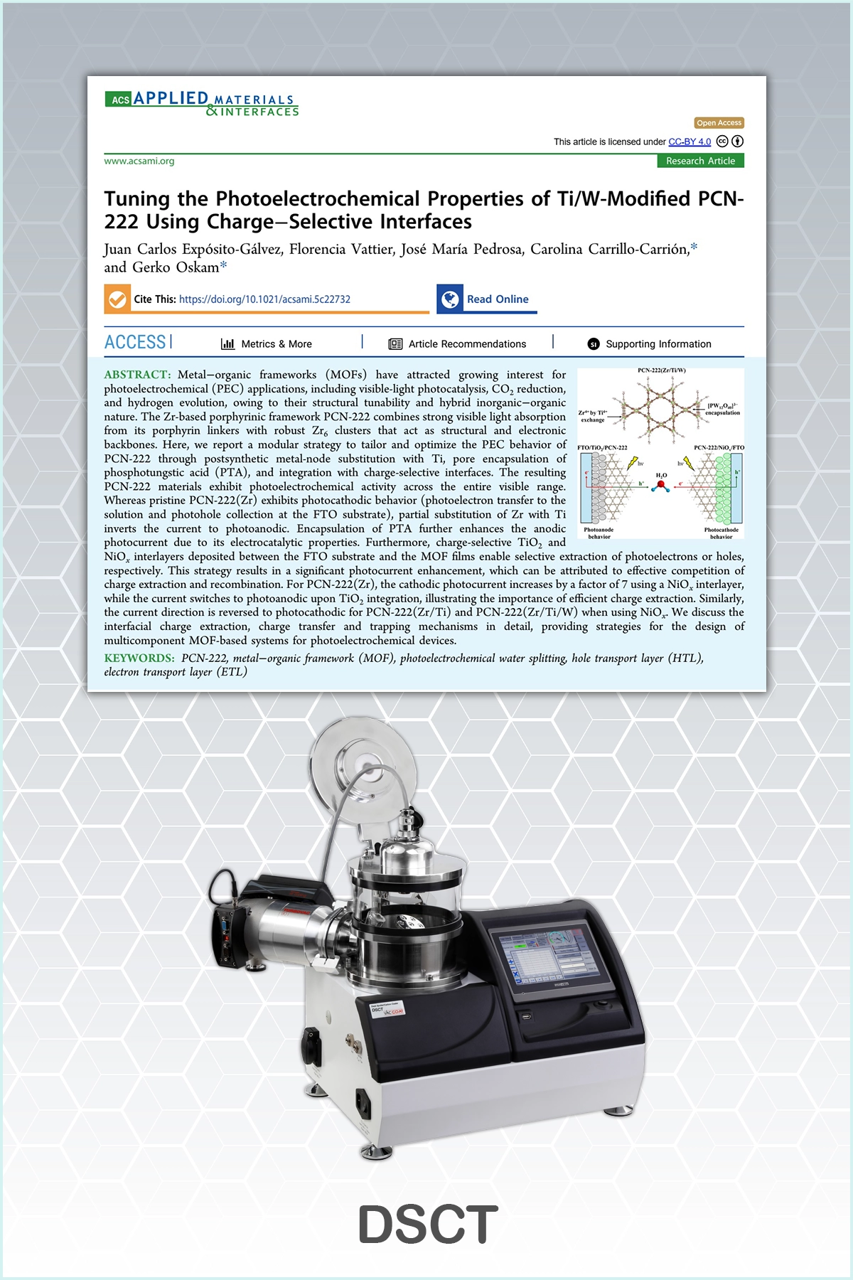 In a research published in the ACS publications, 2026, licensed under CC-BY 4.0, the photoelectrochemical (PEC) performance of the Zr-based MOF, PCN-222 is optimized by substitution of Ti for Zr nodes, pore encapsulation with phosphotungstic acid (PTA), and the integration of charge-selective interlayers (e.g., TiO2 or NiOx).