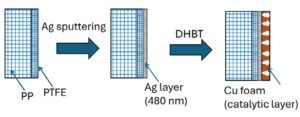 The structure was created using PTFE/PP bilayer fabric substrates that were sputter-coated on the PTFE side with a 480 nm-thick Ag layer with Vac Coat Desk DST1-170 Sputter Coater. Subsequently, the DHBT process was employed to generate porous Cu foam structures directly on the Ag-coated substrates. In the final step, ionomer treatment was performed to impart hydrophobicity to the Cu foam gas‑diffusion electrodes (GDEs) for elctrocatalysis processes, such as converting carbon dioxide into valuable products.